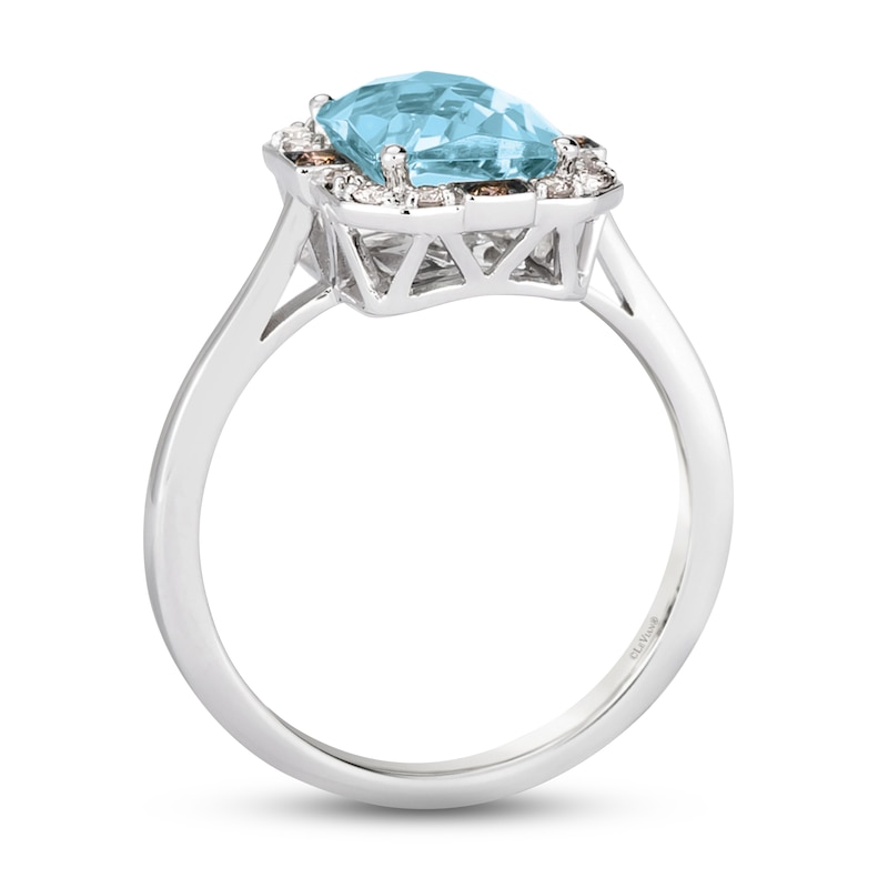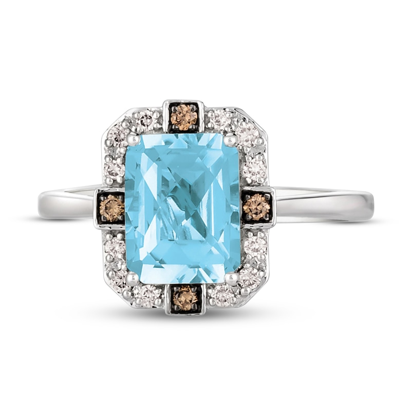 A lavish emerald-cut Sea Blue Aquamarine® is framed by glittering Nude Diamonds™ in this remarkable Le Vian® ring for her. Chocolate Diamonds® add extra decadence to the rich 14K Vanilla Gold® ring and bring the total diamond weight to 1/6 carat. Le Vian®. Discover the Legend. This ring is available in limited sizes. If you don't see your size here, please visit a store to order your ring.