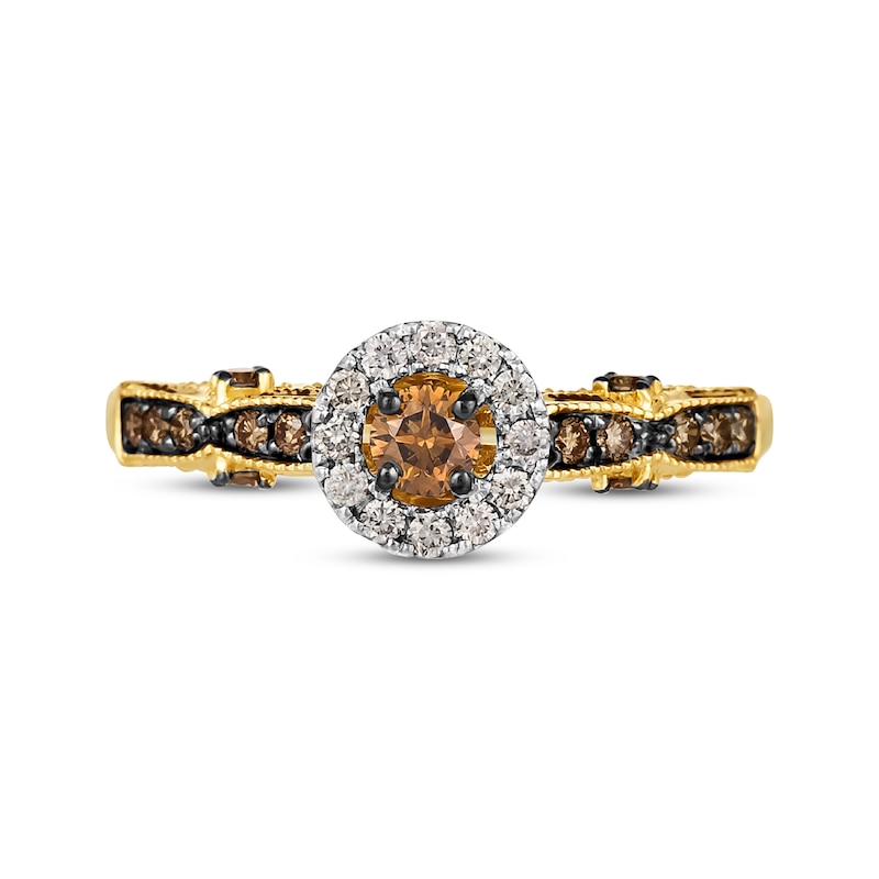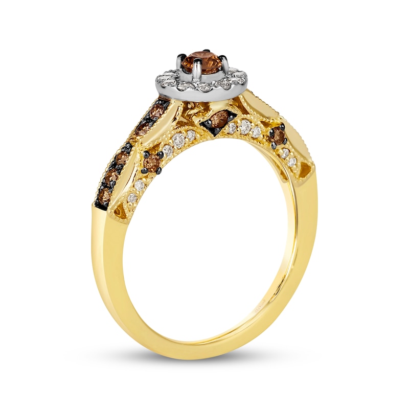 A delicious design, this ring from Le Vian® tempts your taste. Crafted in 14K Honey Gold™, the look showcases a round-cut Chocolate Diamonds® center stone in a halo of 14K Vanilla Gold® frosted with round Nude Diamonds™. Round Chocolate Diamonds® decorate the fancy shank, while round Nude Diamonds™ and Chocolate Diamonds® along the sides assure sparkle from every angle. This ring has a total diamond weight of 5/8 carat. Le Vian®. Discover the Legend. This ring is available in limited sizes. If you don't see your size here, please visit a store to order your ring.