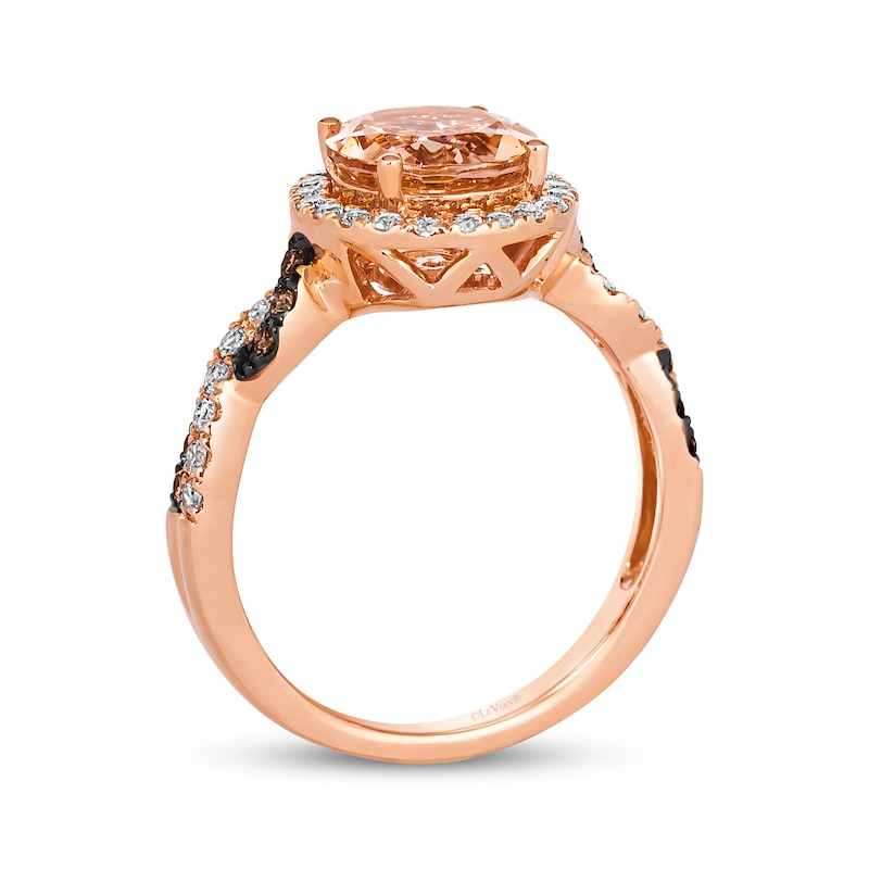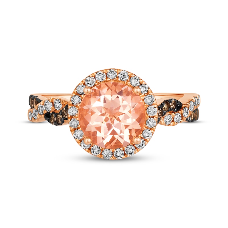 Make a grand impression with this extraordinary Le Vian® ring from the KAY exclusive Chocolate Twist™ collection. At its center, a fresh round Peach Morganite™ is wrapped in a frame of dazzling Nude Diamonds™. Nude Diamonds™ and rich Chocolate Diamonds® in black rhodium plate adorn the twisted shank. This on-trend design is styled in 14K Strawberry Gold® and has a total diamond weight of 3/8 carat. Le Vian®. Discover the Legend. This ring is available in limited sizes. If you don't see your size here, please visit a store to order your ring.