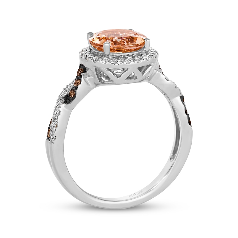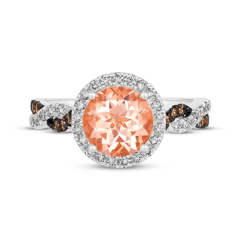 This Le Vian® ring from the Kay-exclusive Chocolate Twist™ collection showcases a round-cut Peach Morganite™ wrapped in a halo of round-cut Nude Diamonds™. Crafted in 14K Vanilla Gold®, the blushing style has a twist shank decorated in round-cut Chocolate Diamonds® and Nude Diamonds™ for a total diamond weight of 3/8 carat. Le Vian®. Discover the Legend. This ring is available in limited sizes. If you don't see your size here, please visit a store to order your ring.