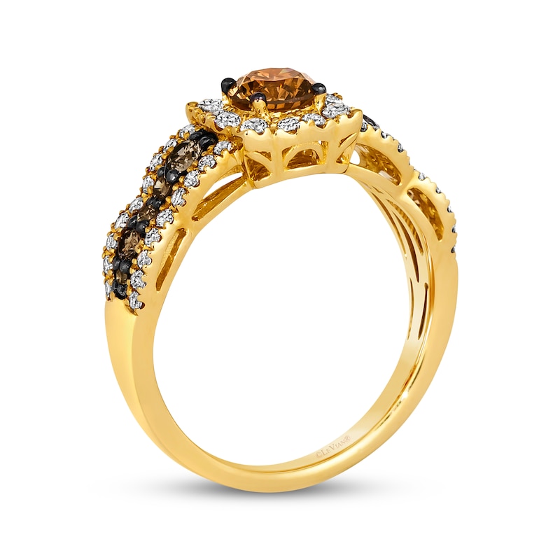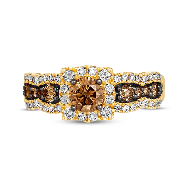 A delicious design, this Le Vian® ring from the KAY exclusive Chocolate Waterfall™ collection takes the cake. At the center, a rich 1/2-carat round-cut Chocolate Diamond is wrapped in a frame of dazzling round-cut Nude Diamonds™. Along the shank, rich round-cut Chocolate Diamonds® in black rhodium plate are trimmed in sweet scalloped edges of Nude Diamonds™. This bold ring is styled in 14K Honey Gold™ and has a total diamond weight of 1 1/5 carats. Le Vian®. Discover the Legend. This ring is available in limited sizes. If you don't see your size here, please visit a store to order your ring.