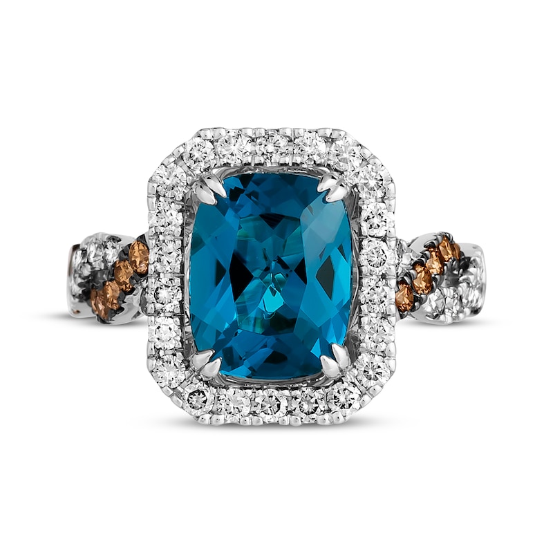 Spice up your wardrobe with the sumptuous look of this ring from Le Vian®. Crafted in 14K Vanilla Gold®, this vibrant style showcases a cushion-cut Deep Sea Blue Topaz™ wrapped in a frame of round-cut Nude Diamonds™. More round-cut Nude Diamonds™ and Chocolate Diamonds® twist along the shank for a total diamond weight of 7/8 carat. Le Vian®. Discover the Legend. This ring is available in limited sizes. If you don't see your size here, please visit a store to order your ring.