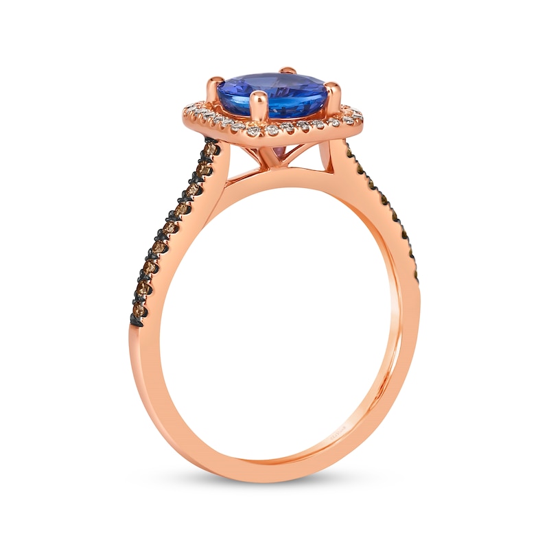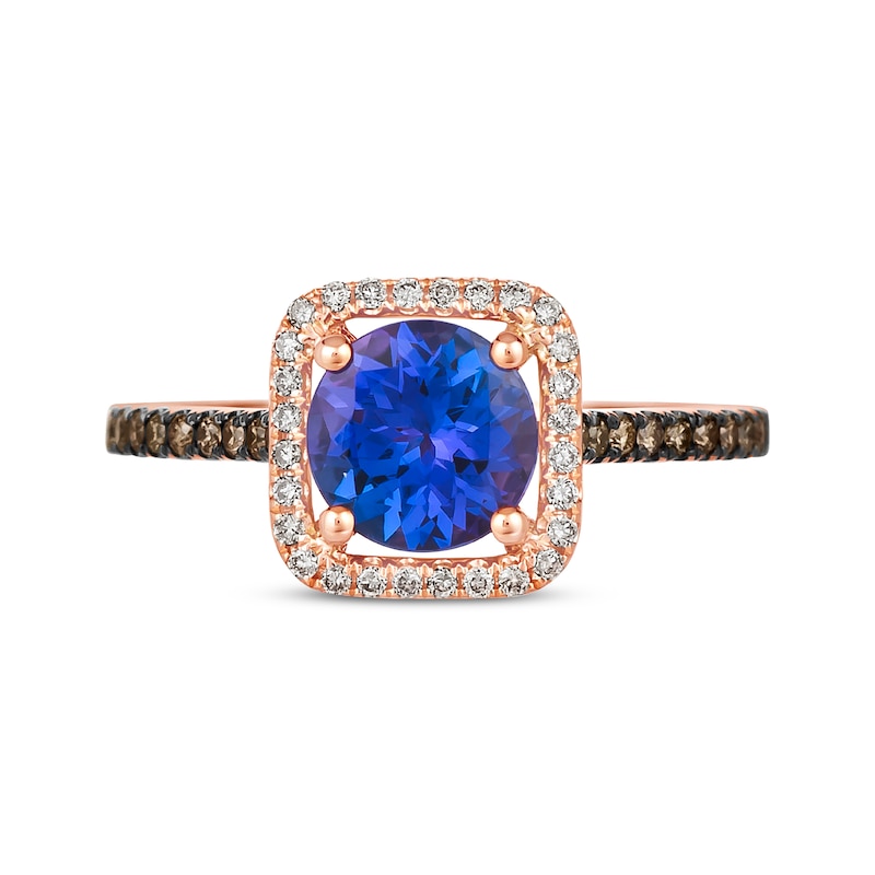 Simply styled, this ring from Le Vian® is a delectable choice. Crafted in 14K Strawberry Gold®, the bright round-cut Blueberry Tanzanite® at the center is wrapped in a cushion-shaped halo frame of round sweet Nude Diamonds™. Along the shank, rich round Chocolate Diamonds® bring the total diamond weight to 1/4 carat. Le Vian®. Discover the Legend. This ring is available in limited sizes. If you don't see your size here, please visit a store to order your ring.