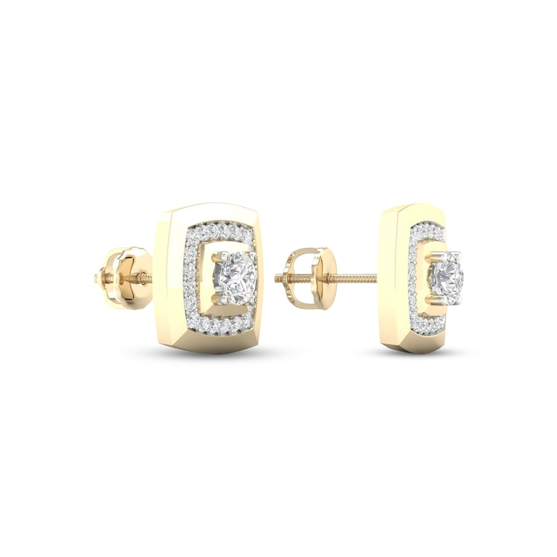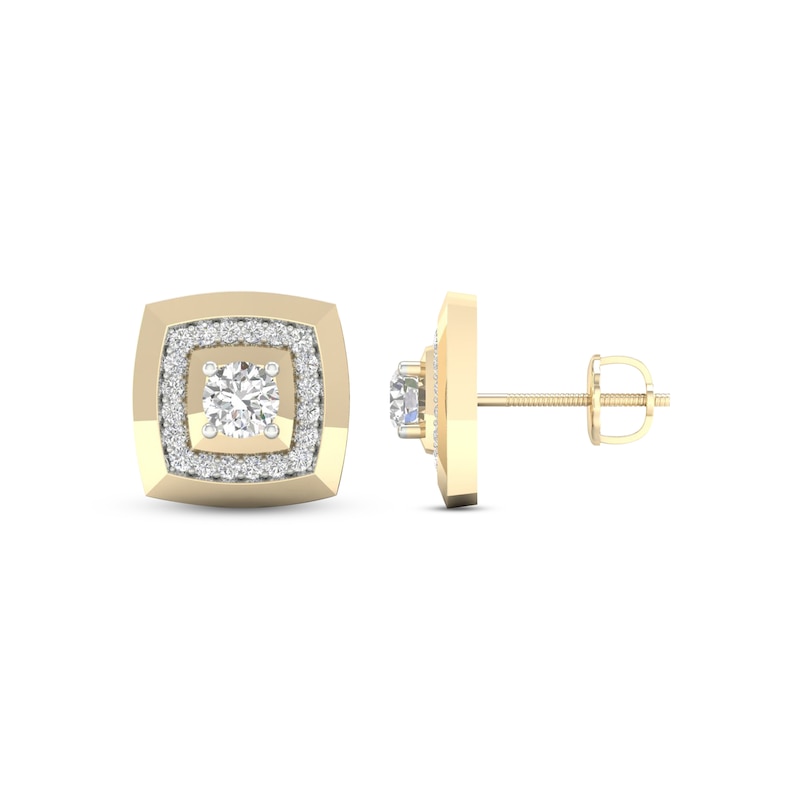 These dapper cushion-shaped stud earrings are crafted in 14K yellow gold and feature a bright 1/3-carat round-cut lab-created diamond at the center. More lab-created diamonds form a sparkling frame and give the earrings a total lab-created diamond weight of 1 carat. The lab-created diamonds are independently certified, and the earrings secure with screw backs. From the Lab-Created Diamonds by KAY collection.