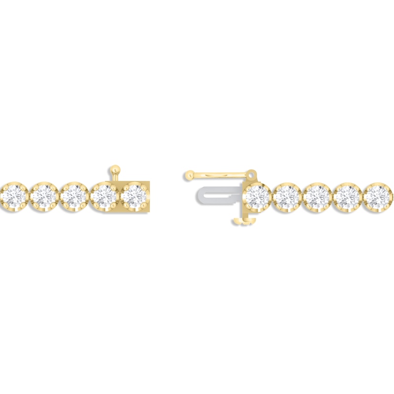 Brilliant round-cut, independently certified lab-created diamonds shimmer along this exquisite line bracelet for her. Crafted in timeless 14K yellow gold, the style has a total lab-created diamond weight of 5 carats. The 7-inch bracelet secures with a box clasp. From the Lab-Created Diamonds by KAY collection.
