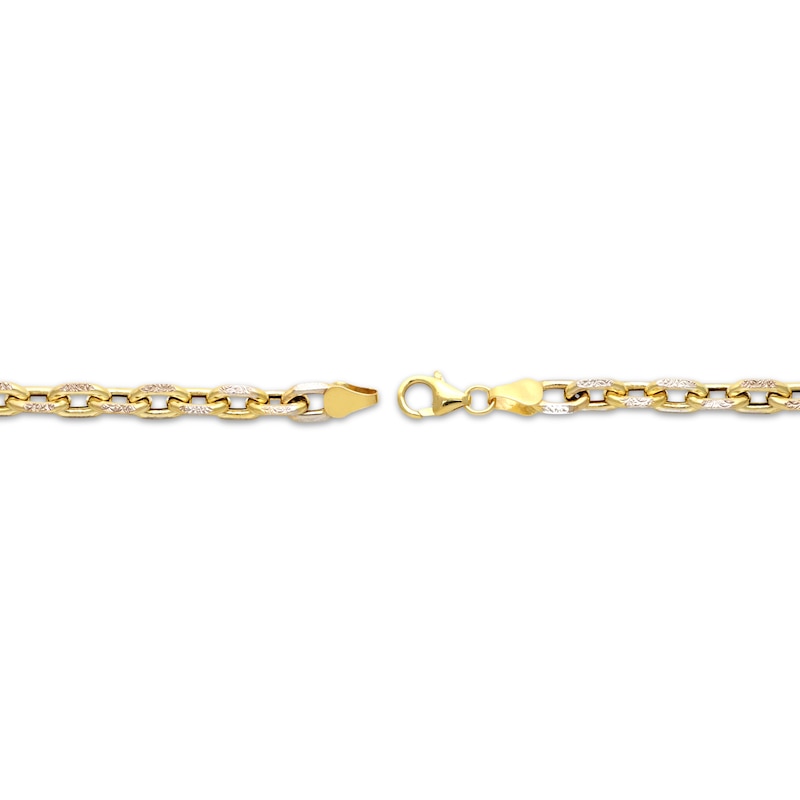 Make a statement with the shimmer of this 7.7mm cable chain necklace. Crafted in 10K yellow gold, each hollow link shines with a diamond-cut finish and white rhodium detail. The 18-inch chain secures with a lobster clasp. Made in Italy.