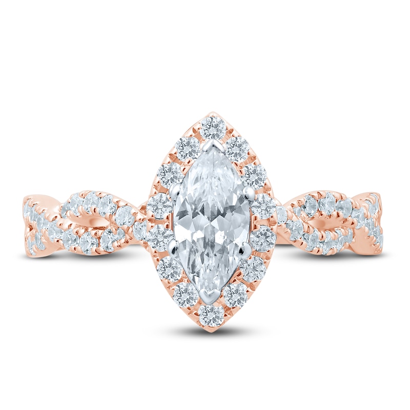 A beautiful 1/2-carat marquise-cut diamond shines at the center of this dreamy engagement ring. Set in romantic 14K rose gold, brilliant round diamonds halo the center stone and shimmer down the twisted band. The ring has a total diamond weight of 1 1/6 carats and from the Now & Forever® bridal collection.