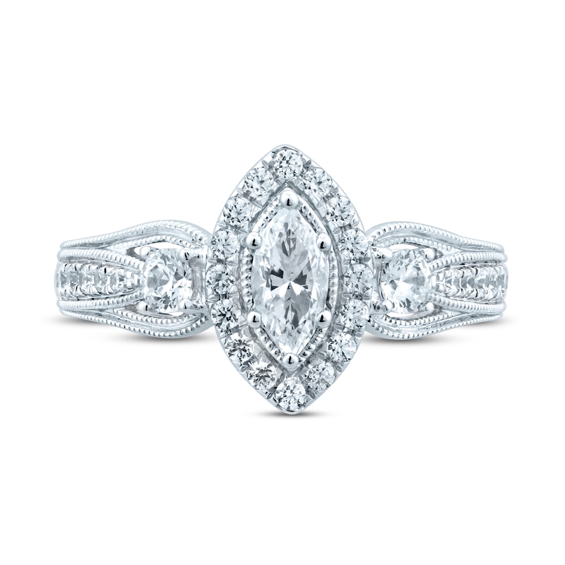 A breathtaking marquise-cut diamond sparkles at the center of this engagement ring, haloed by brilliant round diamonds. More round diamonds shimmer down the sides of the band for a total diamond weight of 1 carat. The ring is crafted in iconic 14K white gold and finished with classic milgrain detailing. From the Now & Forever® bridal collection.