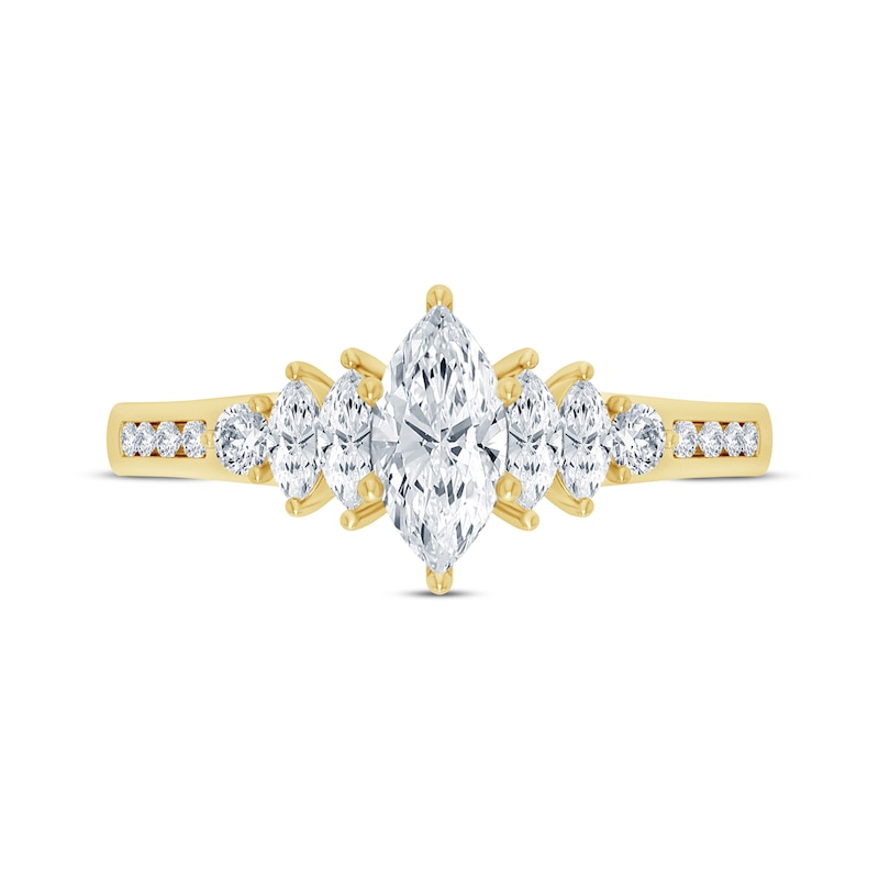 Your love is one-of-a-kind, and this marvelously modern engagement ring reflects its sparkling singularity. A 1/2-carat marquise-cut diamond shines as the focal point, flanked by more marquise-cut diamonds of different sizes. Round-cut diamonds punctuate the ends of the graduating center design, while dainty round diamonds glimmer in channel settings on the band. Styled in classic 14K yellow gold, the ring has a total diamond weight of 7/8 carat. From the Now & Forever® bridal collection.