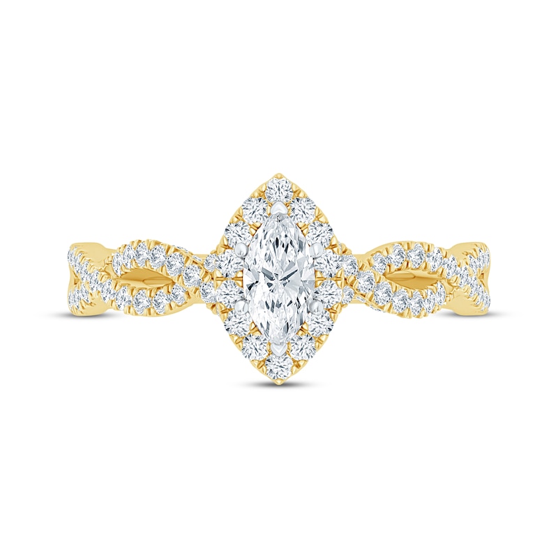 A resplendent 1/3-carat marquise-cut diamond glows as the focal point of this beautiful engagement ring, haloed in brilliant round diamonds. Ribbons of radiant round diamonds interweave along the twisted, split-shank band, complemented by classic milgrain detailing. More round diamonds dance across the bridge for a total diamond weight of 3/4 carat. The ring is styled in timeless 14K yellow gold and is from our Now & Forever® bridal collection.