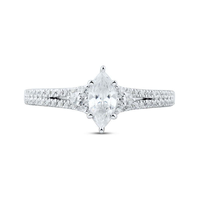 Charm and delight your soon-to-be fiancée with this gorgeous engagement ring. A 1/2-carat marquise-cut diamond draws the eye, flanked by brilliant trios of round diamonds. The split shank is adorned in more round diamonds for alluring sparkle. The ring is crafted in 14K white gold and has a total diamond weight of 3/4 carat. From the Now & Forever® bridal collection.