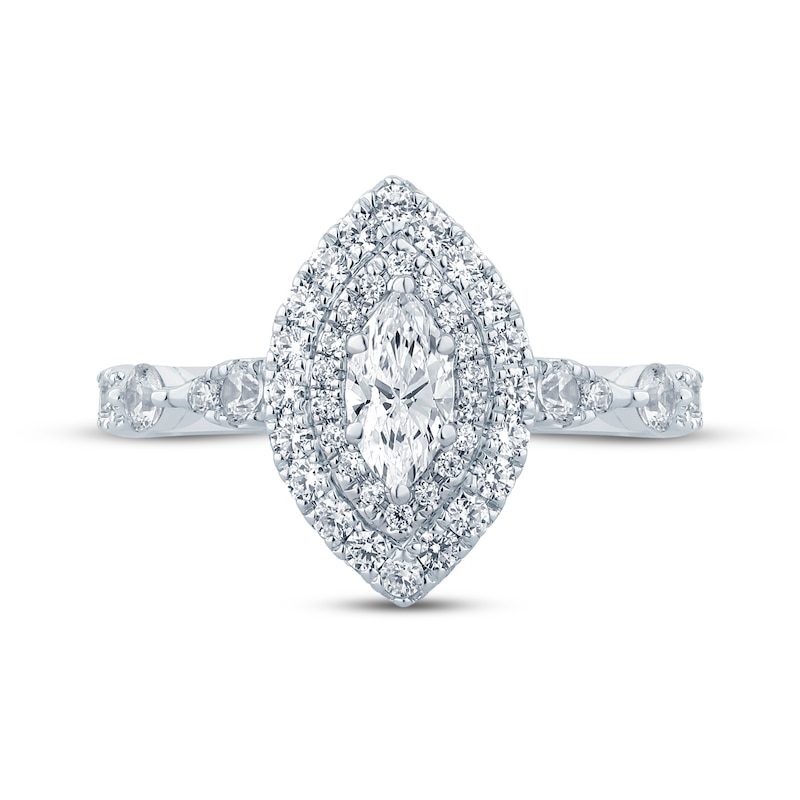 Dramatic and dazzling, this engagement ring is the one she's been dreaming of. A 1/3-carat marquise-cut diamond is wrapped in a double frame of round diamonds at the center. More round diamonds twinkle down the band, which is crafted in 18K white gold, for a total diamond weight of 1 1/8 carats. The independently certified center diamond is laser-inscribed with a unique Gemscribe® serial number to ensure your peace of mind. From the Monique Lhuillier Bliss collection, available exclusively at KAY. Please note: This ring is available in limited sizes. If you don't see your size here, please visit a store to order your ring.