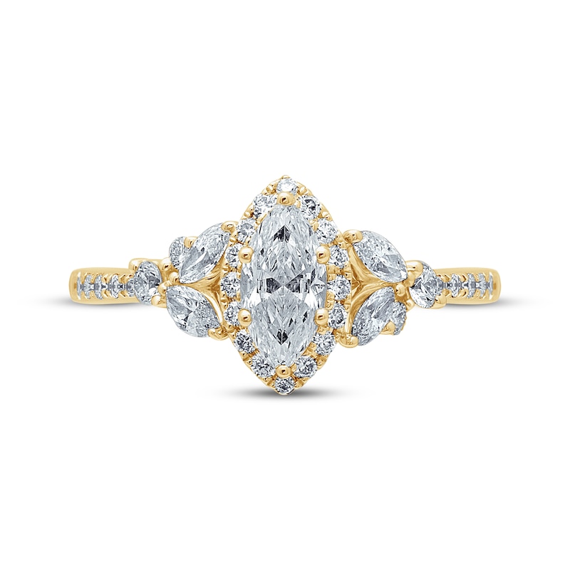 Match her unforgettable elegance with this splendid engagement ring. A glowing 1/2-carat marquise-cut diamond lends vintage appeal to the design when wrapped in a brilliant frame of round diamonds. Glimmering arrays of round and marquise-cut diamonds adorn the flanks, while more round diamonds dance down the band and across the bridge. The ring is styled in timeless 18K yellow gold and has a total diamond weight of 1 1/8 carats. The independently certified center diamond is laser-inscribed with a unique Gemscribe® serial number to ensure your peace of mind. From the Monique Lhuillier Bliss collection, available exclusively at KAY. Please note: This ring is available in limited sizes. If you don't see your size here, please visit a store to order your ring.