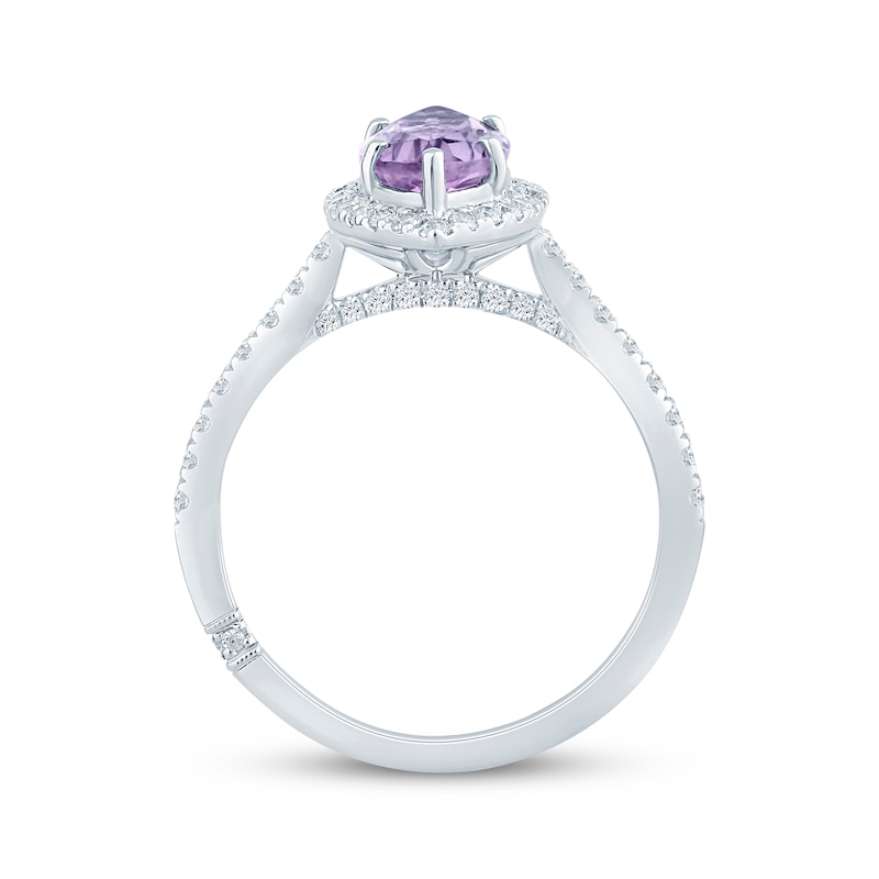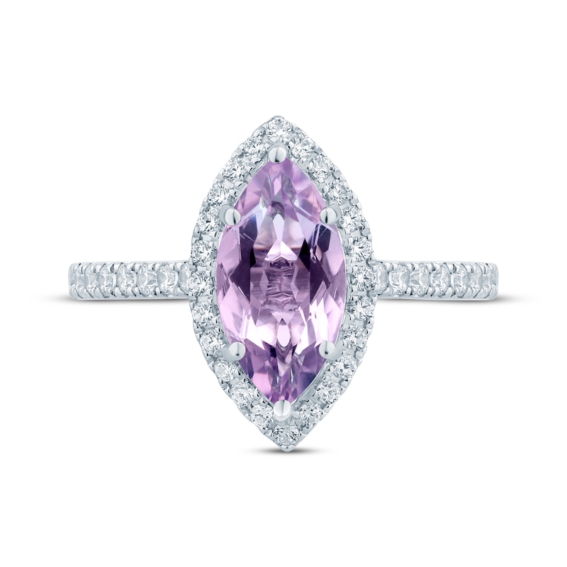 For the one who brings color to your life, this amethyst and diamond engagement ring is a perfect match. This unique style is crafted in 14K white gold. A marquise-cut light amethyst emits beautiful color as the centerpiece. A frame of round-cut diamonds adds divine sparkle and a total diamond weight of 1/2 carat. A signature element of diamonds in milgrain detailing encircles the band, symbolizing unity and eternal love. From the Monique Lhuillier Bliss collection, available exclusively at KAY. Please note: This ring is available in limited sizes. If you don't see your size here, please visit a store to order your ring.