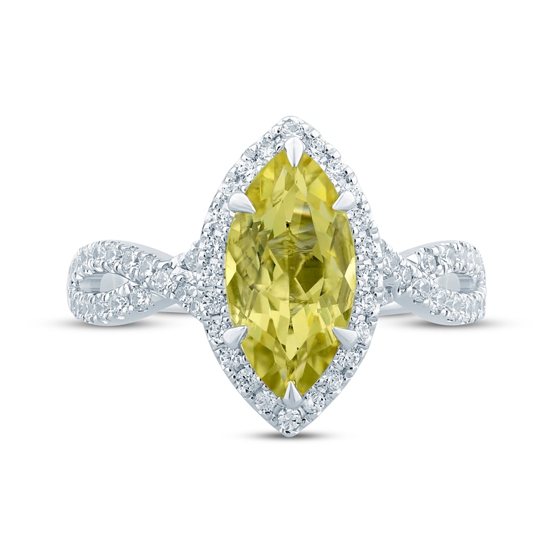 Embrace the exuberant hue of yellow quartz in this gemstone and diamond engagement ring. This exquisite style is crafted in 14K white gold. At the center, a marquise-cut yellow quartz is made even more radiant by a frame of round-cut diamonds. More round diamonds interweave along the twisted shank and dance across the bridge. A signature element of diamonds in milgrain detailing encircles the band, symbolizing unity and eternal love. The ring has a total diamond weight of 1/2 carat. From the Monique Lhuillier Bliss collection, available exclusively at KAY. Please note: This ring is available in limited sizes. If you don't see your size here, please visit a store to order your ring.