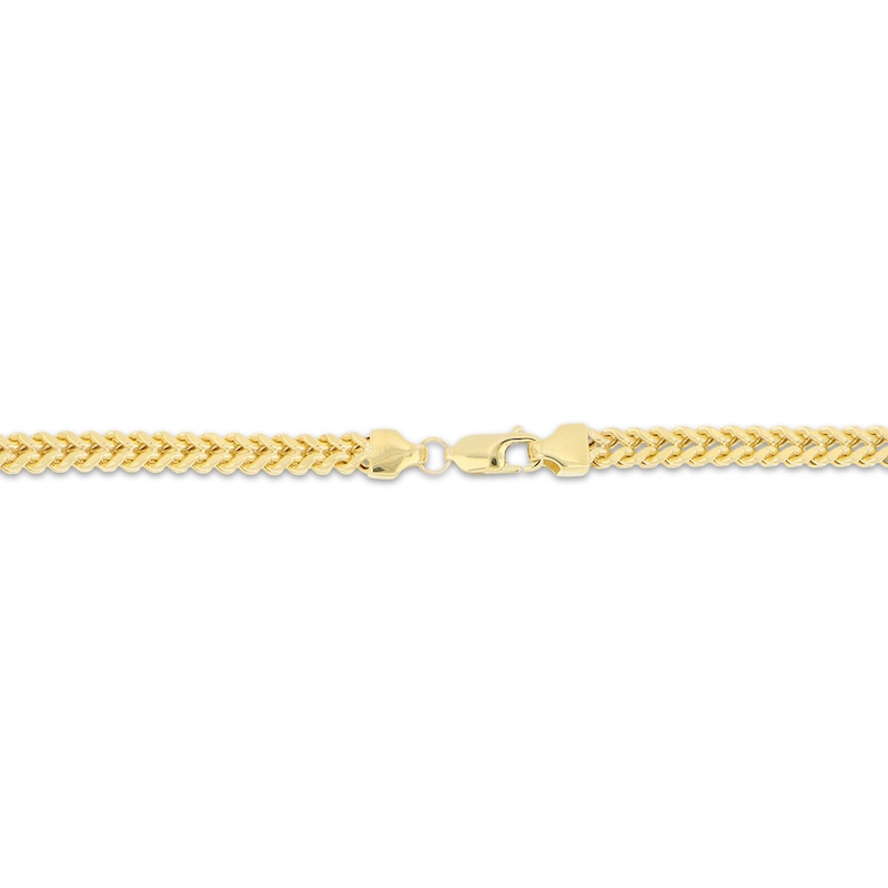 This sleek Franco chain necklace is the perfect everyday statement. Set in timeless 14K yellow gold, the hollow chain has a 120 gauge and measures 5.1mm. The 24-inch chain secures with a lobster clasp.
