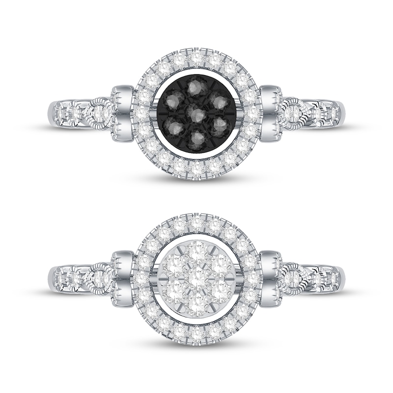 Go from classic to contemporary in a flash with this chic convertible ring. A circular cluster of round-cut white diamonds flips to reveal round-cut black diamonds. More round-cut white diamonds halo the center and sparkle in milgrain-accented settings on the band. The ring is crafted in 10K white gold and has a total diamond weight of 3/8 carat.
