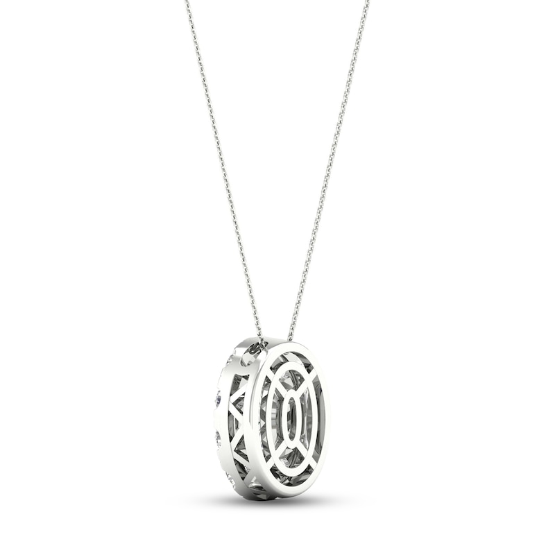 A splendid 1-carat oval-cut diamond shines brightly within a halo of round-cut diamonds on this radiant necklace for her. Fashioned in 14K white gold, the necklace has a total diamond weight of 2 carats. The pendant sways from an 18-inch cable chain that secures with a lobster clasp.