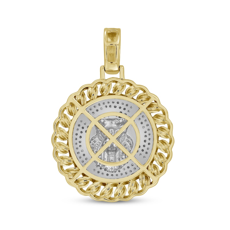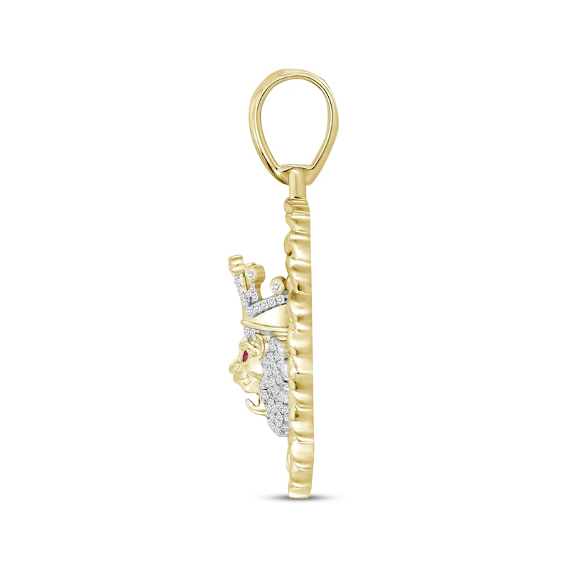 Make a fierce statement with this stunning lion pendant for him. Set in timeless 10K yellow gold, the lion is wearing a diamond-embellished crown and features lab-created ruby eyes. Brilliant round-cut diamonds sparkle around the center, and a beautiful link chain frame surrounds the pendant, finishing the look. The pendant has a total diamond weight of 3/8 carat; chain sold separately.