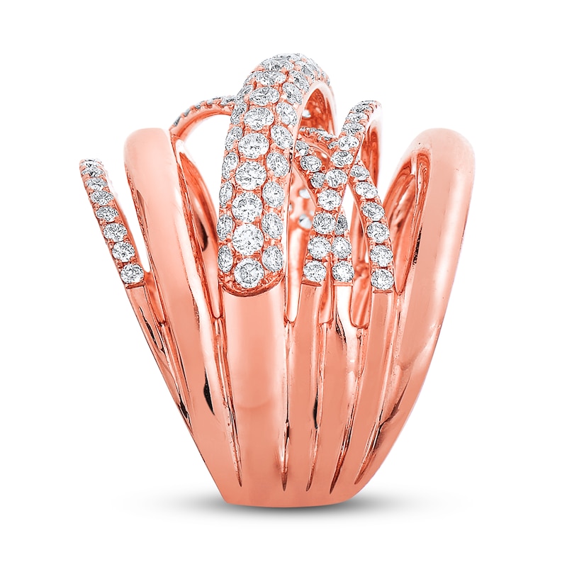 Ribbons of 14K rose gold intermingle in this exciting ring for her, decked out in shimmering round diamonds. The stylish ring has a total diamond weight of 1 1/2 carats.