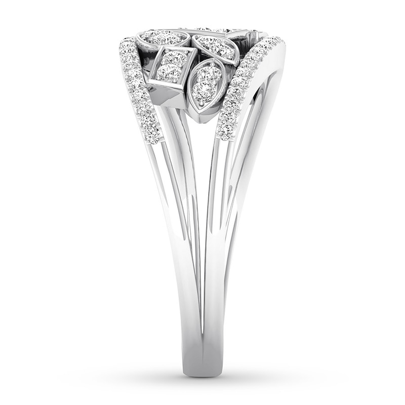 A collage of geometric shapes and sparkling round diamonds make this ring a chic must-have. The ring is crafted of versatile 10K white gold and has a total diamond weight of 3/8 carat.