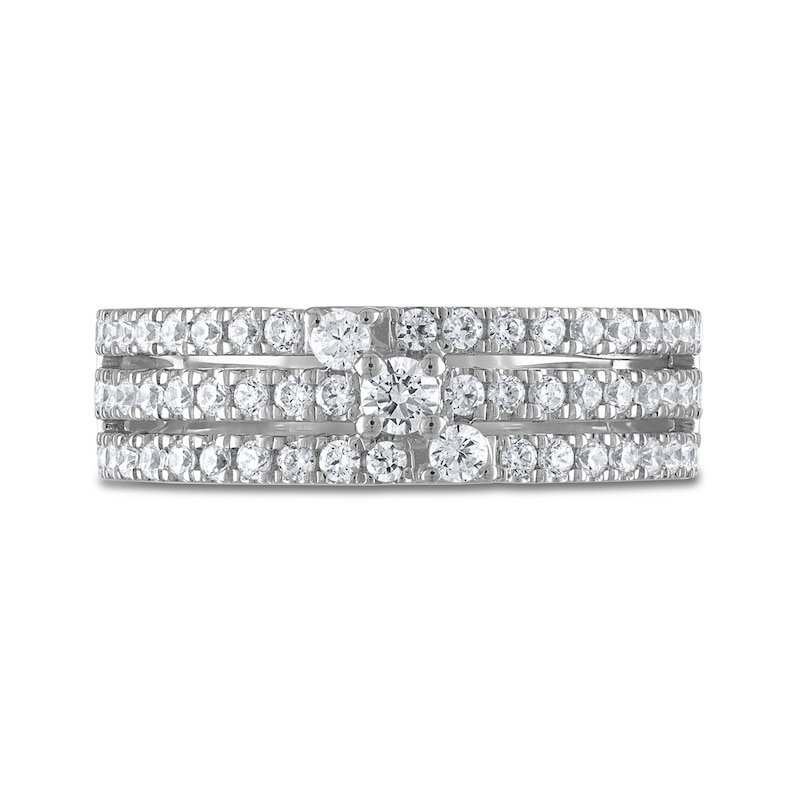 Whether you’re shopping to propose, already proposed, or browsing rings together — we celebrate you, same-sex proposals, weddings, anniversaries and love in all forms! This stunning ring features a trio of radiant round-cut diamonds set diagonally amidst three bands traced in sparkling round diamonds. Crafted in iconic 14K white gold, the ring has a total diamond weight of 3/4 carat and is from our Now & Forever® collection. Styles for all, available in sizes 5 - 12.