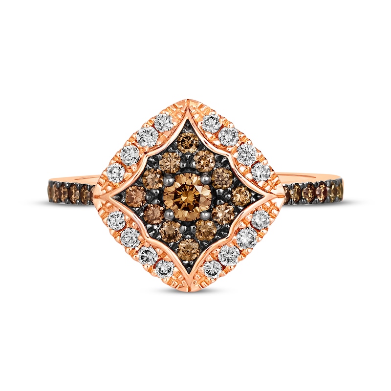Dreams are made of rings such as this delicious style from Le Vian®. Created in 14K Strawberry Gold®, the arabesque center frame is filled with round-cut Chocolate Diamonds® and wrapped in a cushion-shaped border of round-cut Nude Diamonds™. More Chocolate Diamonds® decorate the tapered shank for a total diamond weight of 3/4 carat. Le Vian®. Discover the Legend. This ring is available in limited sizes. If you don't see your size here, please visit a store to order your ring.