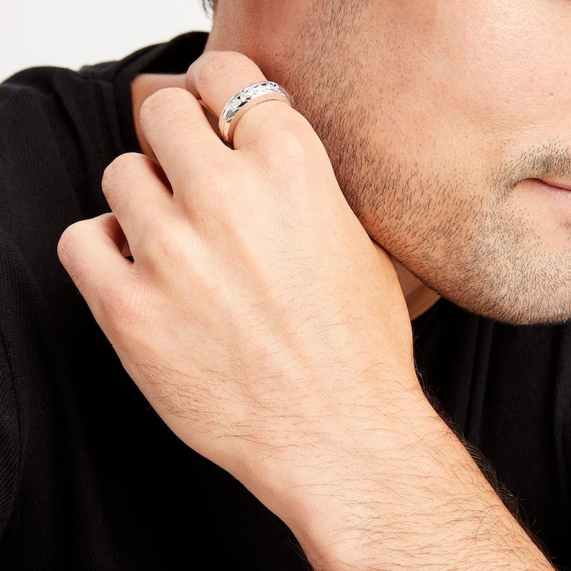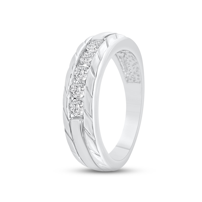 This cool and classic wedding band for him is crafted in iconic 10K white gold and adorned with sleek grooves. Five brilliant round diamonds totalling 1/2 carat in weight shine at the center. From the Now & Forever® collection.