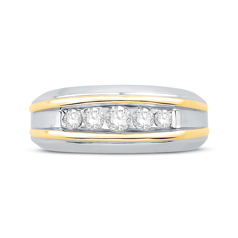This diamond wedding band is one he'll love to wear. The sculpted rhodium-finished 14K white gold band features five graduated-size round diamonds along the center, bordered with raised 14K yellow gold ribbons. This ring has a total diamond weight of 1/2 carat. From the Now & Forever® collection.