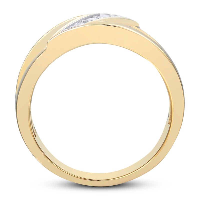 This handsome men's wedding band features a diagonal row of brilliant round-cut diamonds set in a rhodium flash. The 10K yellow gold band features a satin finish and woven detailed design. The ring boasts a total diamond weight of 1/6 carat. From the Now & Forever® collection.