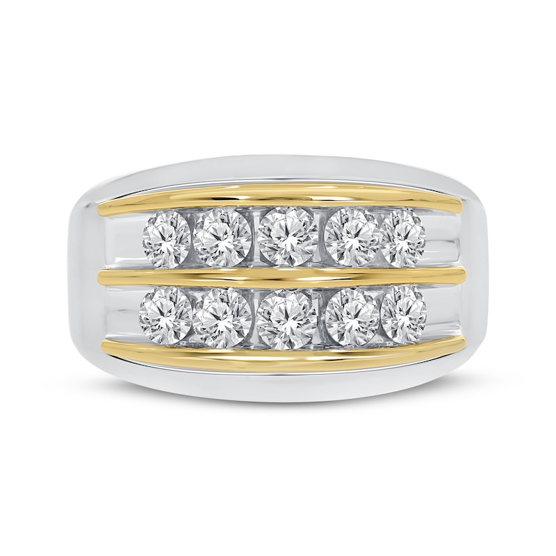 Show your love with this bold diamond wedding band for him. Fashioned in classic 10K white gold, the band features two striking rows of round-cut diamonds along the top. In between the rows of diamonds are details of 10K yellow gold to complete the look. The ring has a total diamond weight of 2 carats and is from the Now & Forever® collection.
