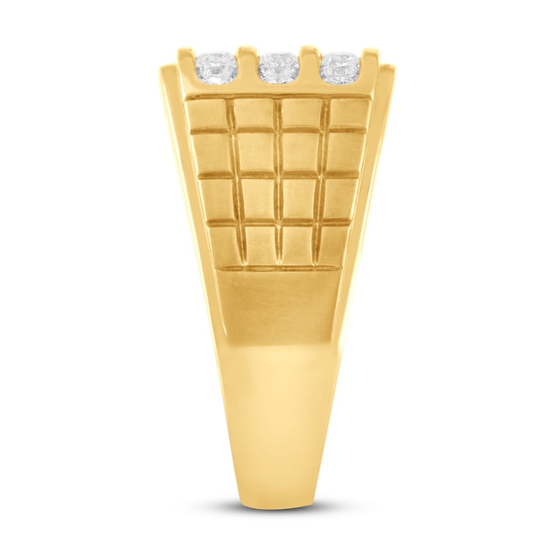 Three rows of brilliant round-cut diamonds sparkle in exquisite rhodium flashes at the center of this handsome wedding band for him. The 10K yellow gold band features textured designs on either side of the band. The ring has a total diamond weight of 3/4 carat. From the Now & Forever® collection.