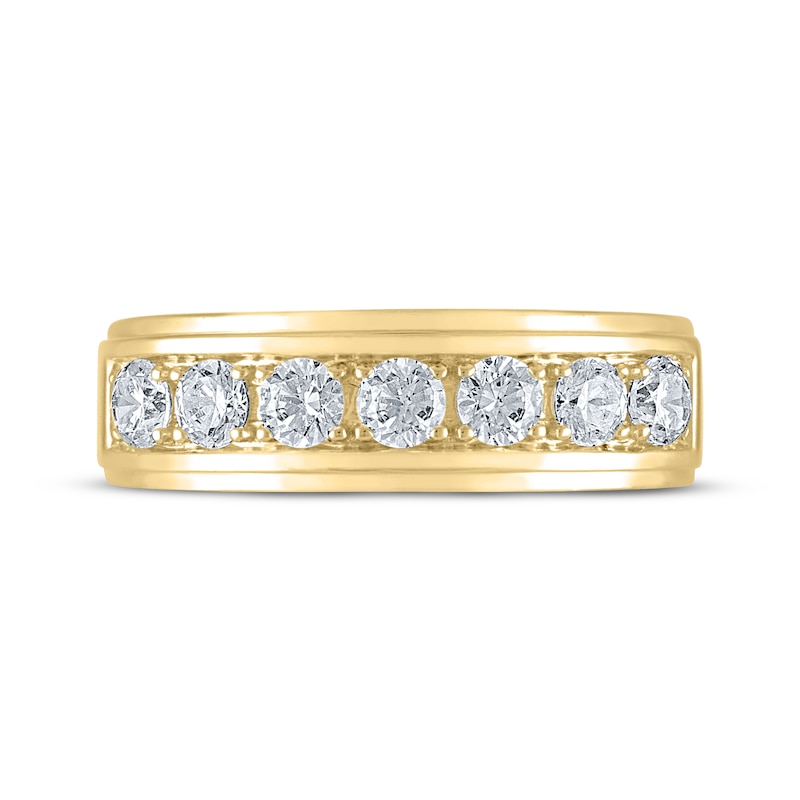 This handsome men's wedding band, from the Leo Diamond®collection, features seven brilliant round diamonds set in classic 14K yellow gold. The band has a total diamond weight of 1 carat and the diamonds are independently certified.