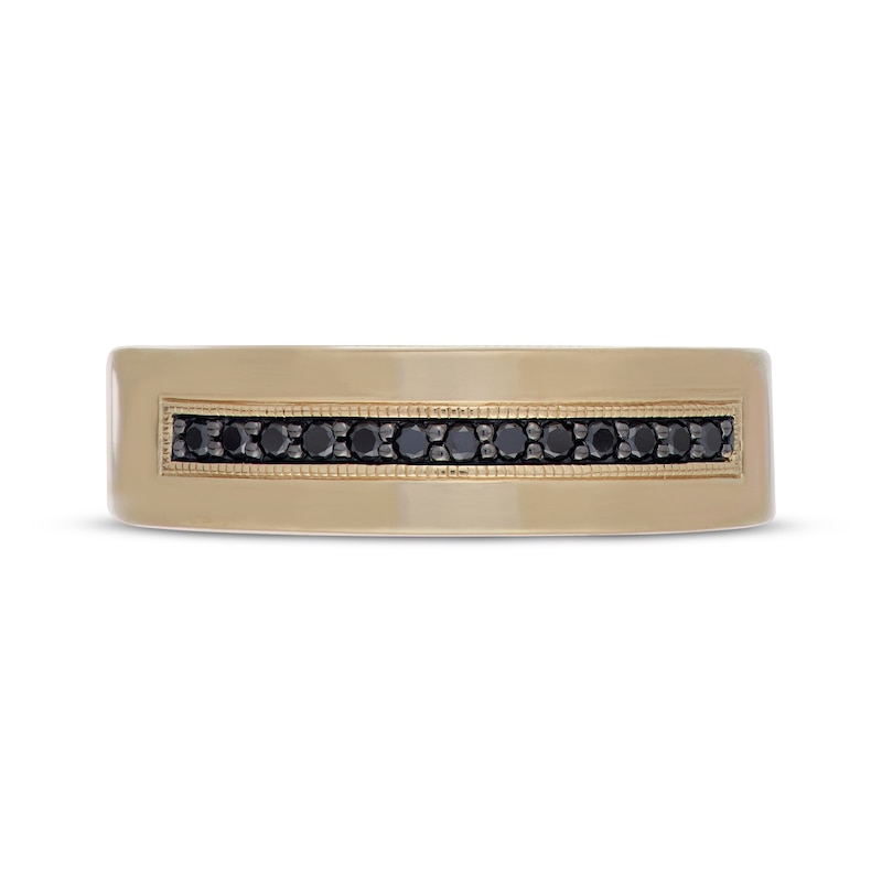 This sleek men's wedding band from Neil Lane® collection features a striking line of round black diamonds framed in milgrain detailing. Crafted of 14K yellow gold, the band has a total diamond weight of 1/6 carat.