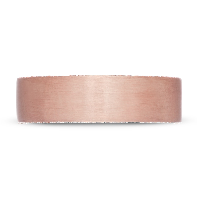 Bold round diamonds trace each profile's edge of this Neil Lane™ men's wedding band for a striking, contemporary look. The 14K rose gold band features a brushed finish for a finishing touch. The band has a total diamond weight of 1/5 carat.