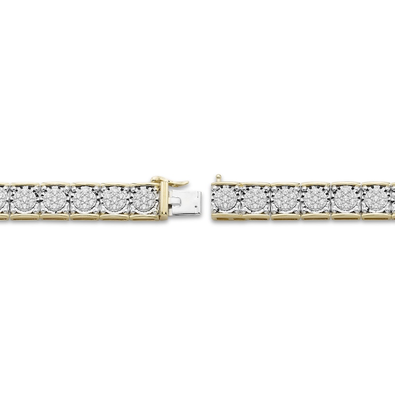 Clusters of round-cut diamonds shimmer along gleaming 10K yellow gold links in this distinguished tennis bracelet for him. Measuring 8.5 inches, the bracelet has a total diamond weight of 2 carats and secures with a tongue clasp.