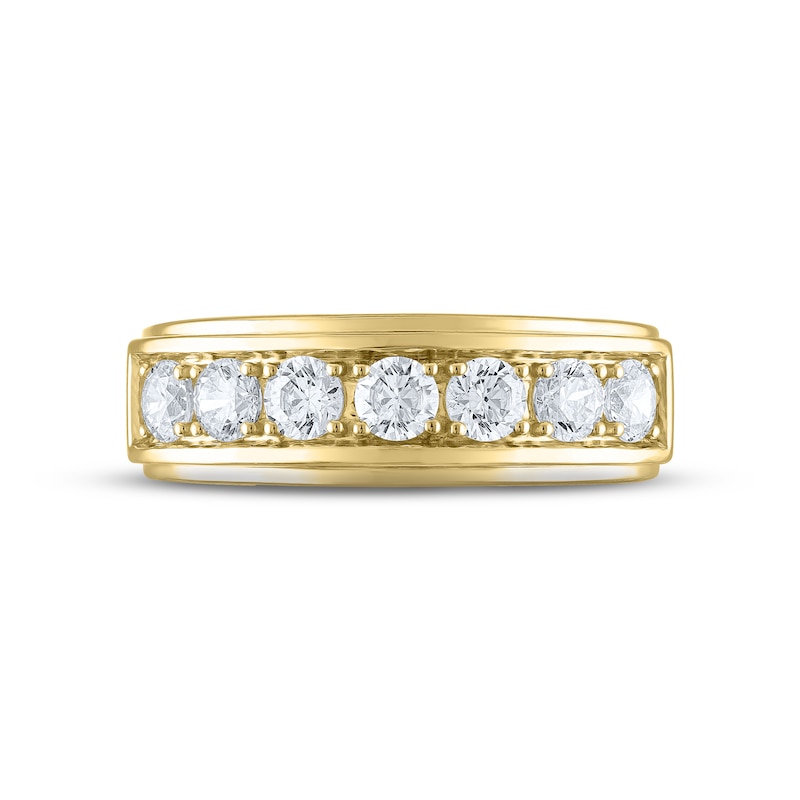 This beautiful men's wedding band from THE LEO Diamond® collection features stunning round-cut diamonds set in classic 14K yellow gold. The independently-certified diamonds total 1 1/2 carats in weight.