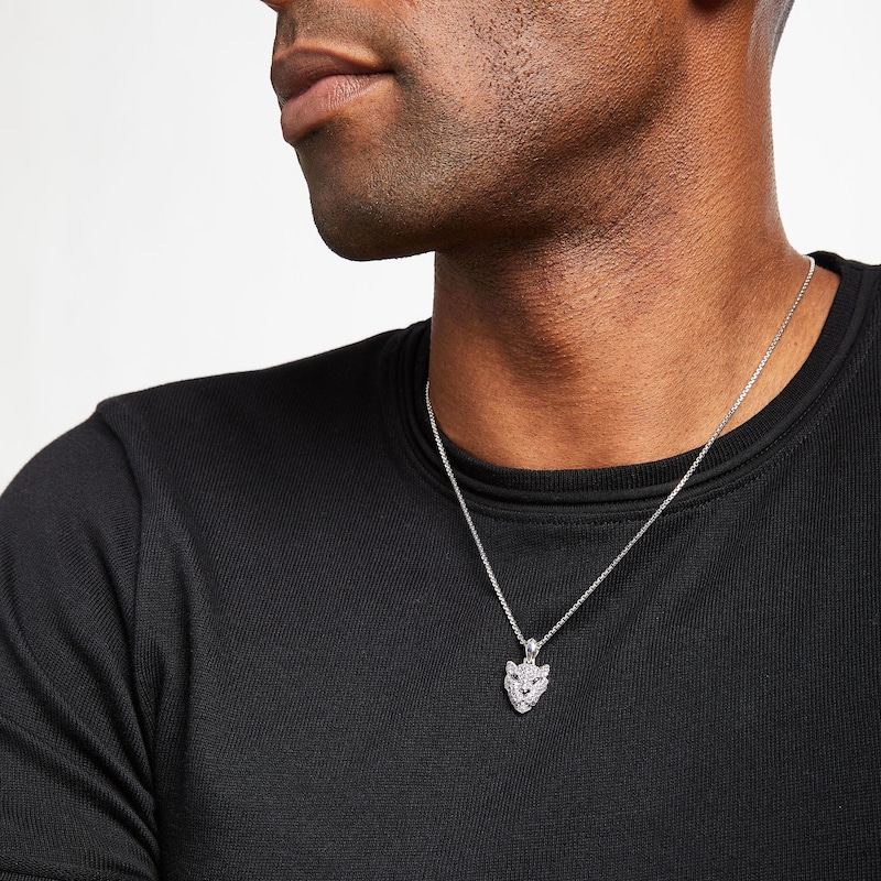 This magnificent men's necklace features a stunning panther pendant comprised of dazzling round white diamonds with round black diamond accents. Styled in lustrous 10K white gold, the necklace has a total diamond weight of 7/8 carat. The pendant sways from a 22-inch box chain and secures with a lobster clasp.