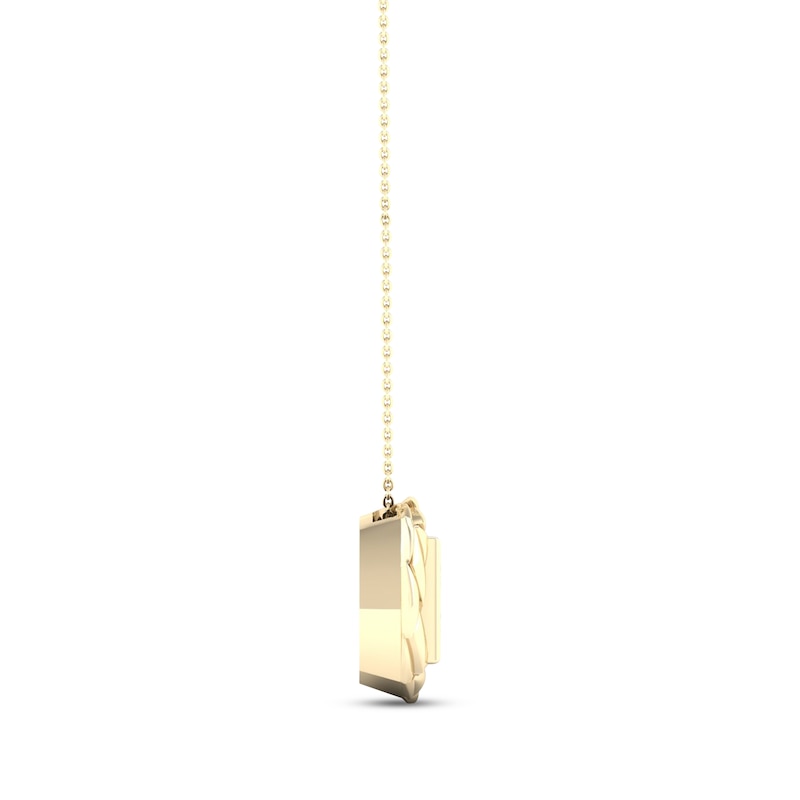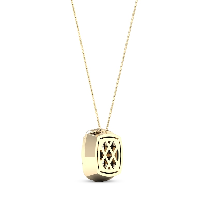 Add intrigue to your look with this eye-catching gender neutral necklace. A quartet of glittering square-cut diamonds is the shining center of attention on the cushion-shaped pendant, framed by unique quilted texturing. Crafted in 10K yellow gold with white rhodium, the necklace has a total diamond weight of 3/8 carat. The pendant sways from an 18-inch cable chain that secures with a lobster clasp.