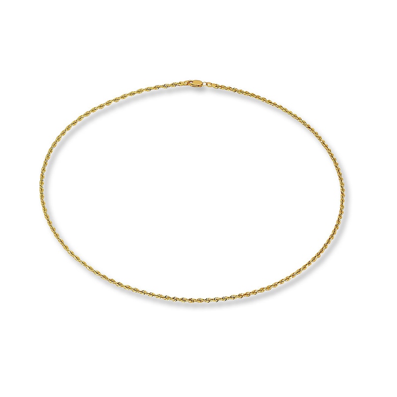 This 24-inch solid rope chain is styled in 14K yellow gold. The fine jewelry necklace is secured with a lobster clasp.