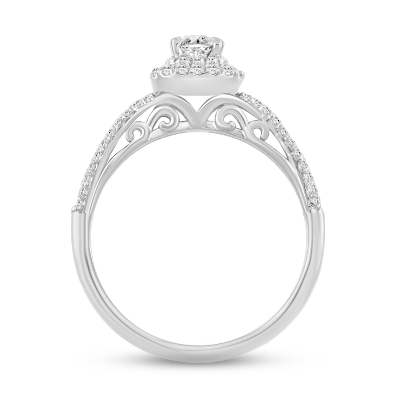 Unmatched in glamor and elegance, this luminous engagement ring displays a 1/2-carat emerald-cut diamond surrounded by a double-frame of round diamonds. More round diamonds shimmer down the edges of the band, while channel-set baguette-cut diamonds shine down the middle. The ring is styled in 14K white gold and has a total diamond weight of 1 carat. From the Now & Forever® bridal collection.