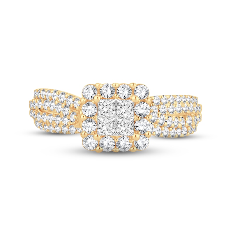 They'll be swept away (and say YES!) with the breathtaking sparkle of this diamond engagement ring. A captivating quartet of princess-cut diamonds emits a chorus of sparkle when lifted and framed by radiant round-cut diamonds. For a delightful finish, the graceful ribbons throughout the band are traced with additional round diamonds. Crafted in classic 14K yellow gold, the ring has a total diamond weight of 1 carat and is from our Now and Forever® bridal collection.
