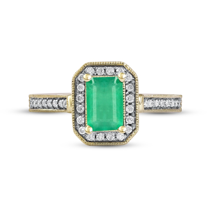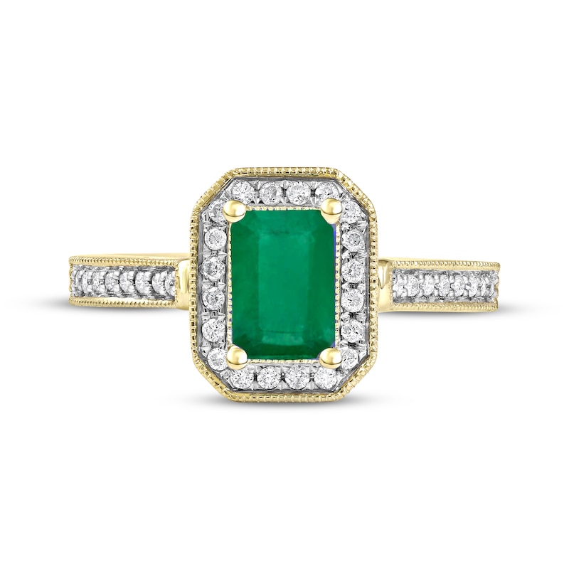 An exquisite emerald-cut emerald glimmers at the center of this beautiful vintage-inspired ring from Natural Precious Gemstones by KAY. Brilliant round-cut diamonds frame the gemstone, and classic milgrain detailing traces the outer edge. More round-cut diamonds and milgrain detailing flow down each side of the band for a total diamond weight of 1/5 carat. The ring is crafted in timeless 10K yellow gold.