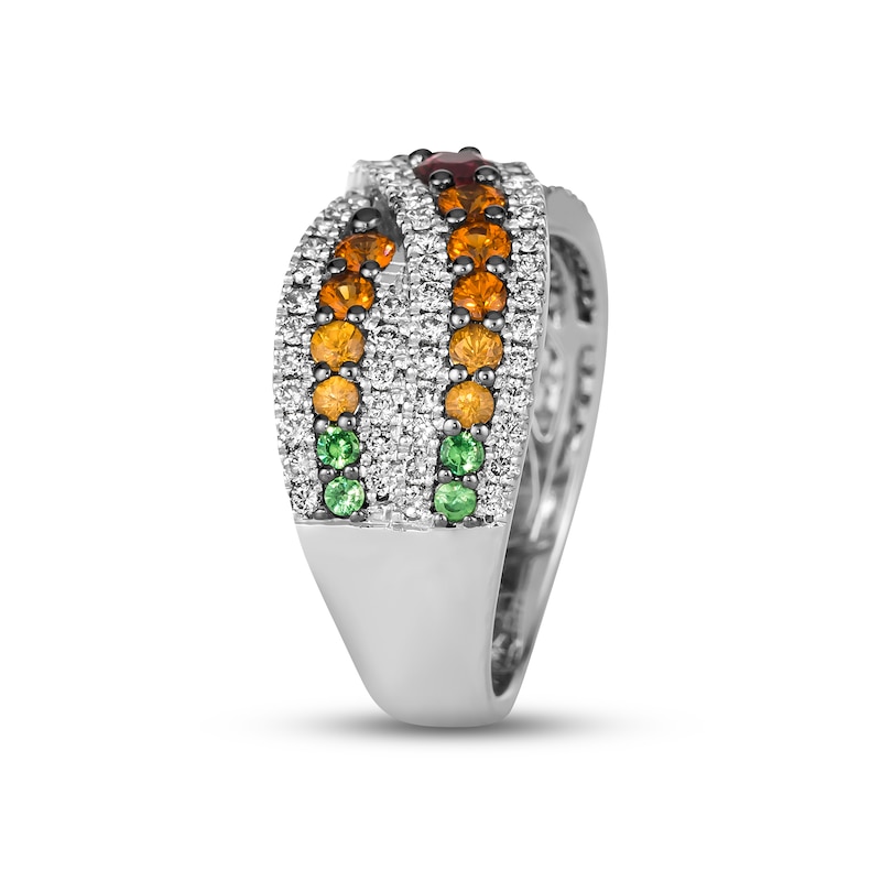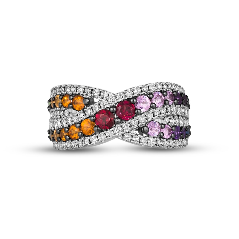 This vibrant ring from Le Vian® showcases an interwoven design of delicious gemstones set in sweet 14K Vanilla Gold®. The ring shines with round-cut spessartite, Bubble Gum Pink Sapphire™, Raspberry Rhodolite™, dark amethyst, Forest Green Tsavorite™, and Blueberry Sapphire™ gemstones. Luscious round-cut Nude Diamonds™ trace along the ring for a total diamond weight of 5/8 carat. Le Vian®. Discover the Legend. This ring is available in limited sizes. If you don't see your size here, please visit a store to order your ring.