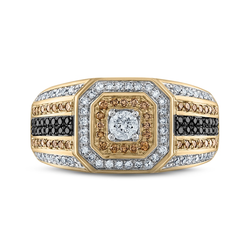 This magnificent ring for him features a brilliant round-cut diamond framed in rich round-cut brown diamonds. An outer frame of round white diamonds adds extra radiance to the striking octagon design, while rows of round black, brown and white diamonds boldly adorn the band. Styled in timeless 10K yellow gold, the ring has a total diamond weight of 7/8 carat.