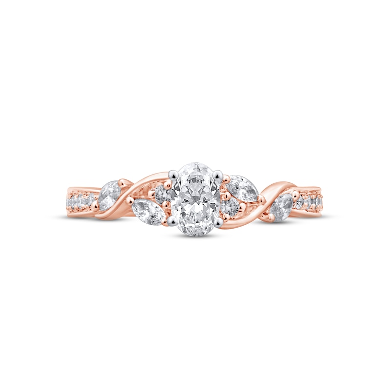A stunning 1/2-carat independently-certified oval-cut diamond sparkles at the center of this radiant engagement ring, set in 18K white gold prongs. A gorgeous array of brilliant round and marquise-cut diamonds shimmer along the 18K rose gold band for a total diamond weight of 7/8 carat. From the Monique Lhuillier Bliss collection, available exclusively at KAY. Please note: This ring is available in limited sizes. If you don't see your size here, please visit a store to order your ring.