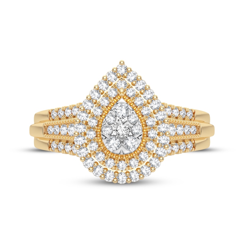 See her eyes sparkle when you present this gorgeous engagement ring. A pear-shaped cluster of round diamonds shimmers in white rhodium at the center, while two halos of round diamonds add mesmerizing radiance to the lovely silhouette. Three rows of round diamonds dance partway down the band for a total diamond weight of 1/3 carat. The ring is crafted in 10K yellow gold and is finished with classic milgrain detailing. From the Now & Forever® bridal collection.