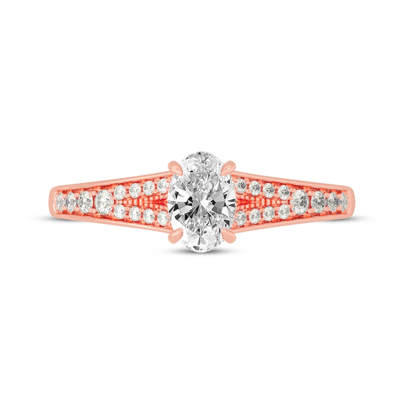 Make the moment special with this sparkling engagement ring. Its shimmering focal point is a 1/2-carat oval-cut diamond. Beneath the center stone, milgrain detailing and round-cut diamonds wrap the gallery. More round-cut diamonds and milgrain line the 14K rose gold split-shank look. This ring has a total diamond weight of 3/4 carat. From the Now & Forever® bridal collection.
