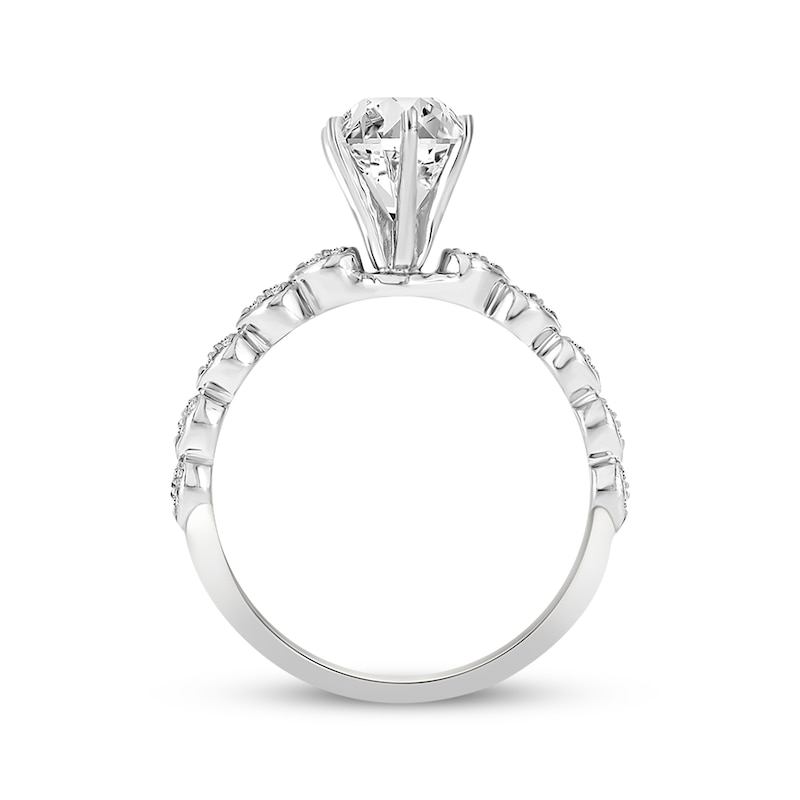 - Pairs of round-cut diamond accents in teardrop shapes sparkle along the shank.