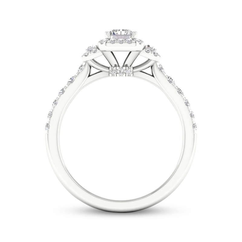 Ask for her hand with this sparkling engagement ring. Crafted in 14K white gold, this dramatic design showcases a radiant-cut diamond at its center, wrapped in a frame of round-cut diamonds and flanked by baguette-cut diamonds. More round diamonds line the shank and along the bridge for a total diamond weight of 7/8 carat. From the Now & Forever® collection.